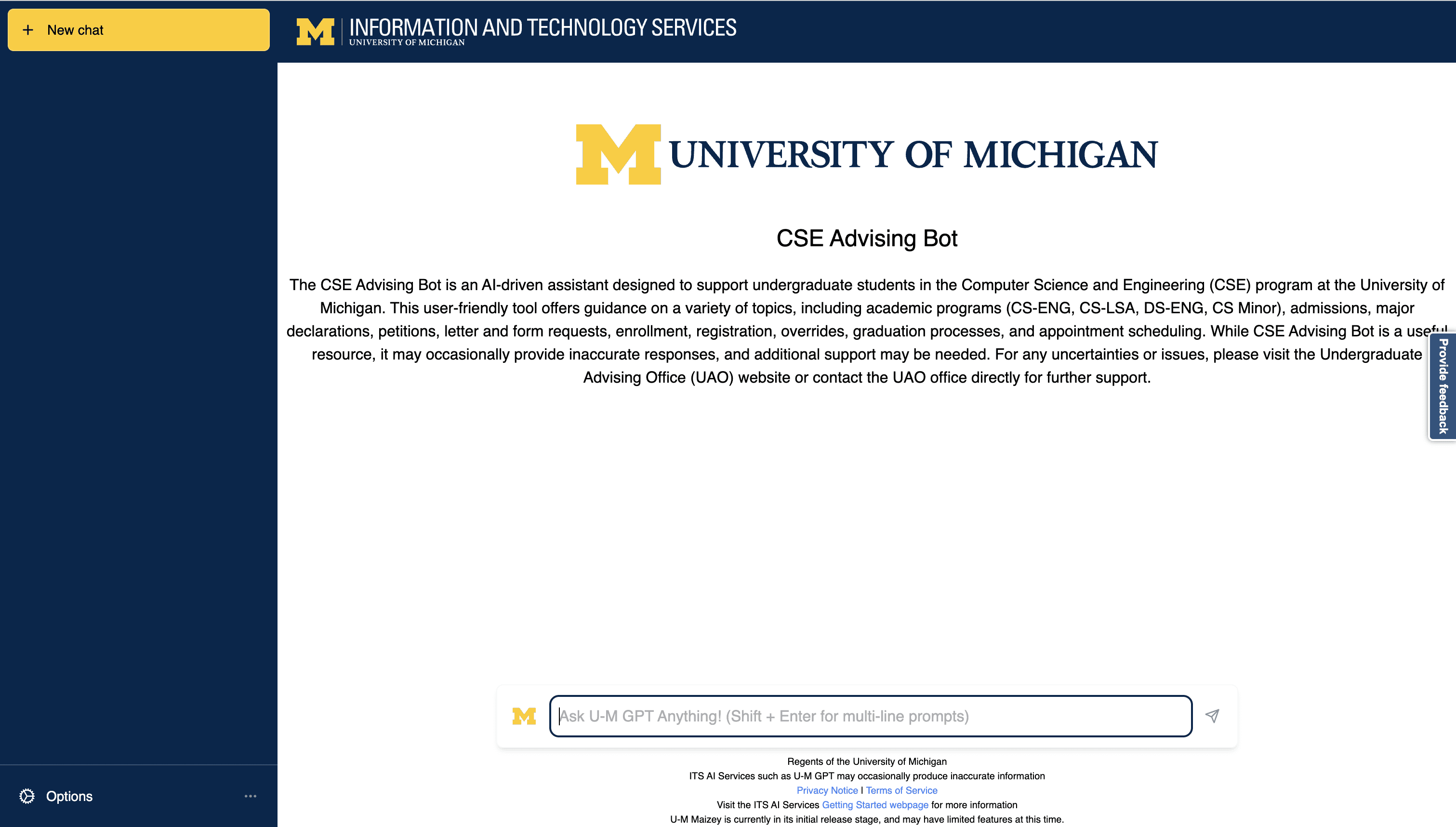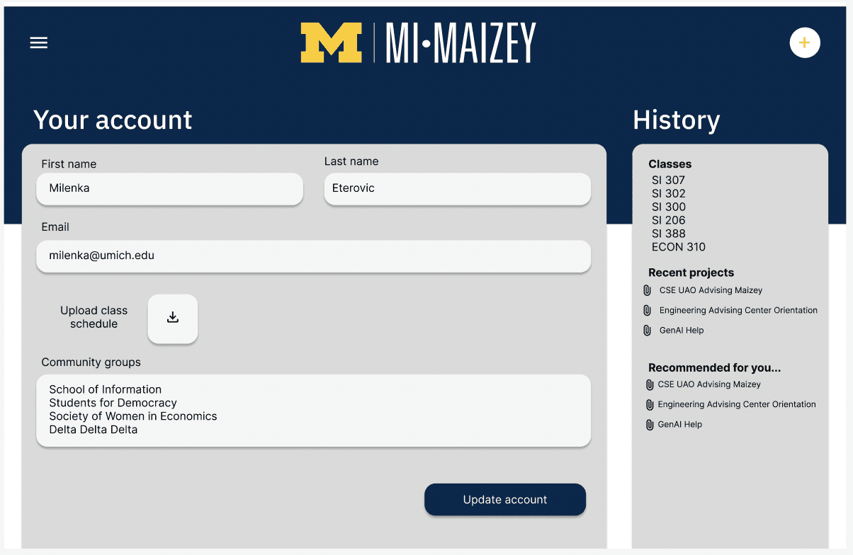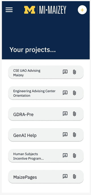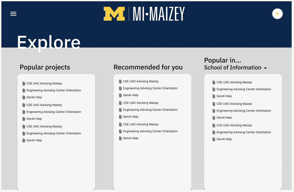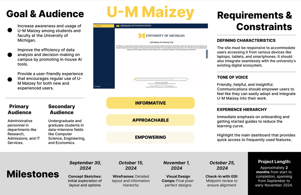 This project focuses on enhancing the usability and adoption of U-M Maizey, the University of Michigan's in-house AI platform. The redesign prioritizes creating a user-friendly interface with improved visual hierarchy, streamlined navigation, and personalized features to better serve the needs of students, faculty, and administrative staff. Through iterative design decisions and user-centered approaches, the project aims to empower users with efficient tools for data analysis, decision-making, and project management.