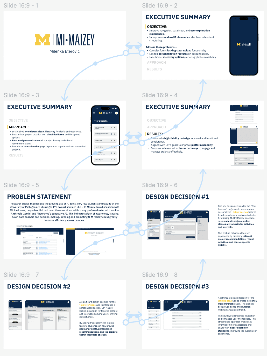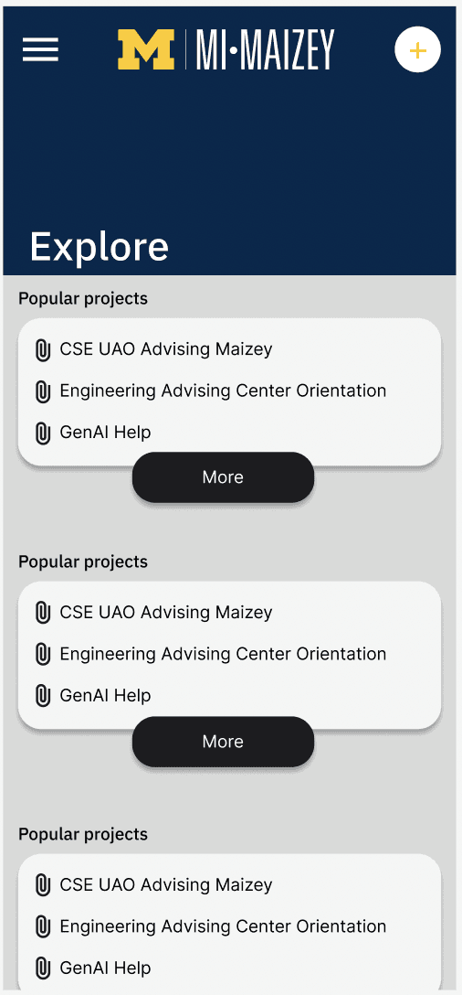 This responsive slide deck presents a comprehensive redesign of MI-Maizey, focusing on improving user navigation, personalization, and engagement. Key features include a high-fidelity interface aligned with the University of Michigan’s visual standards and tailored to address usability challenges. By integrating user-centered design principles, the deck highlights clear design decisions, such as enhancing content discovery, streamlining project management, and promoting AI tools to empower users effectively.