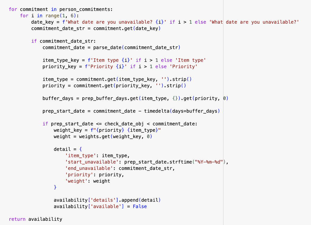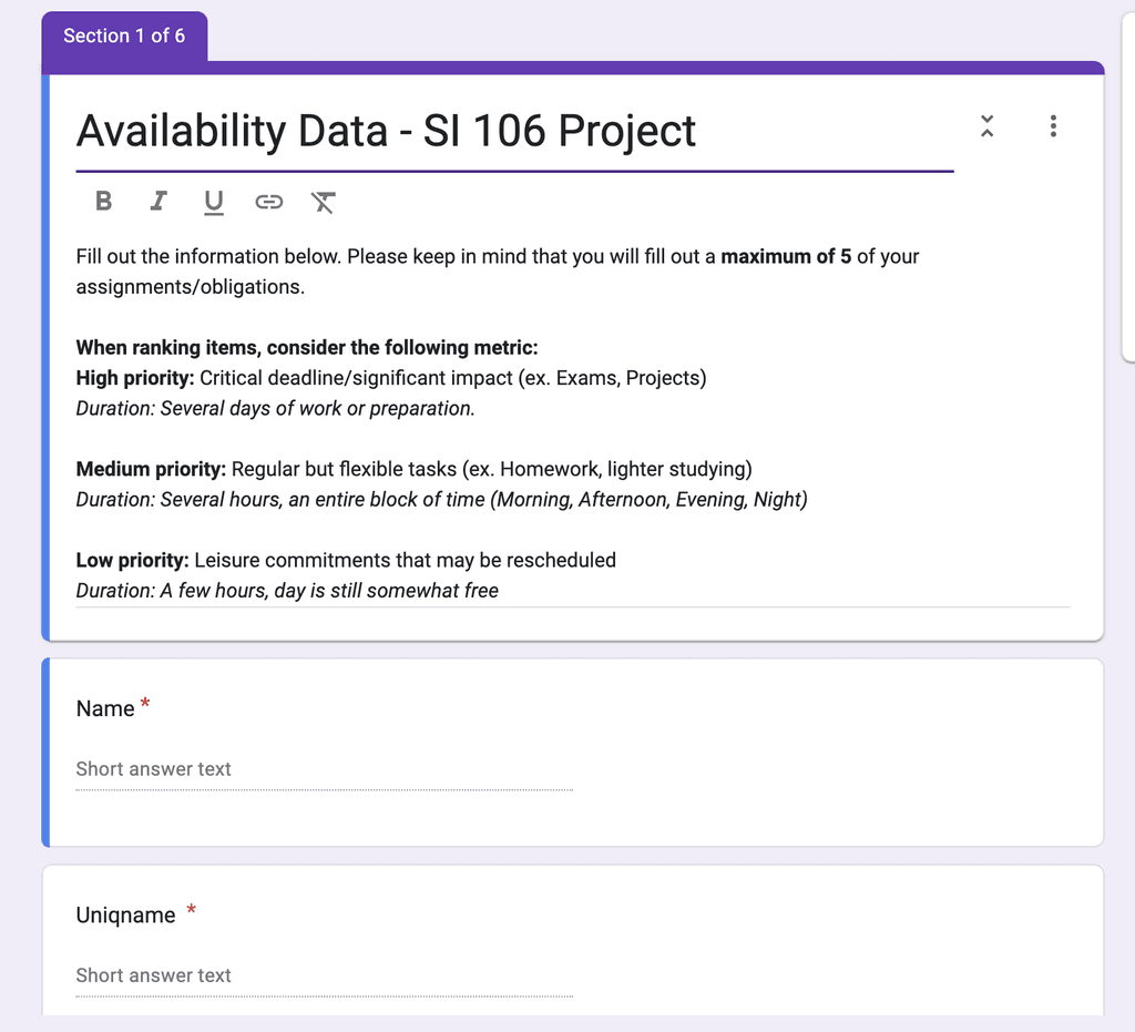 To effectively gauge availability, I developed a custom metric that assigns priority levels to various commitments, like exams, projects, and meetings. By considering the unique demands of each task, I assigned weights that reflect their importance. These weights were informed by feedback from my classmates, who shared insights on how they typically prioritize their own schedules. This method allowed me to create a nuanced system that not only tracks direct commitments but also accounts for necessary preparation time, giving a realistic picture of someone’s availability based on their workload.