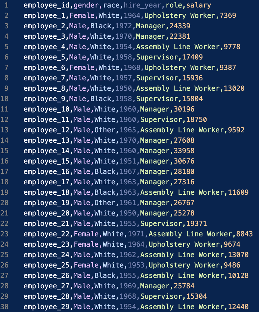 (Left) The employee data lists detailed demographic and salary information, which is used for further analysis on race, gender, and hiring trends.
