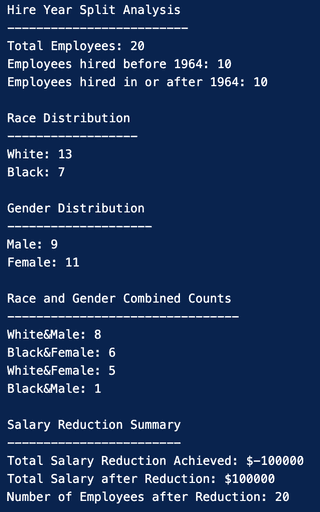 (Right) The output summarizes key insights from the employee data: it includes the breakdown of hires by year, distributions of race and gender, combined counts of race and gender, and a salary reduction summary to achieve cost-saving targets.