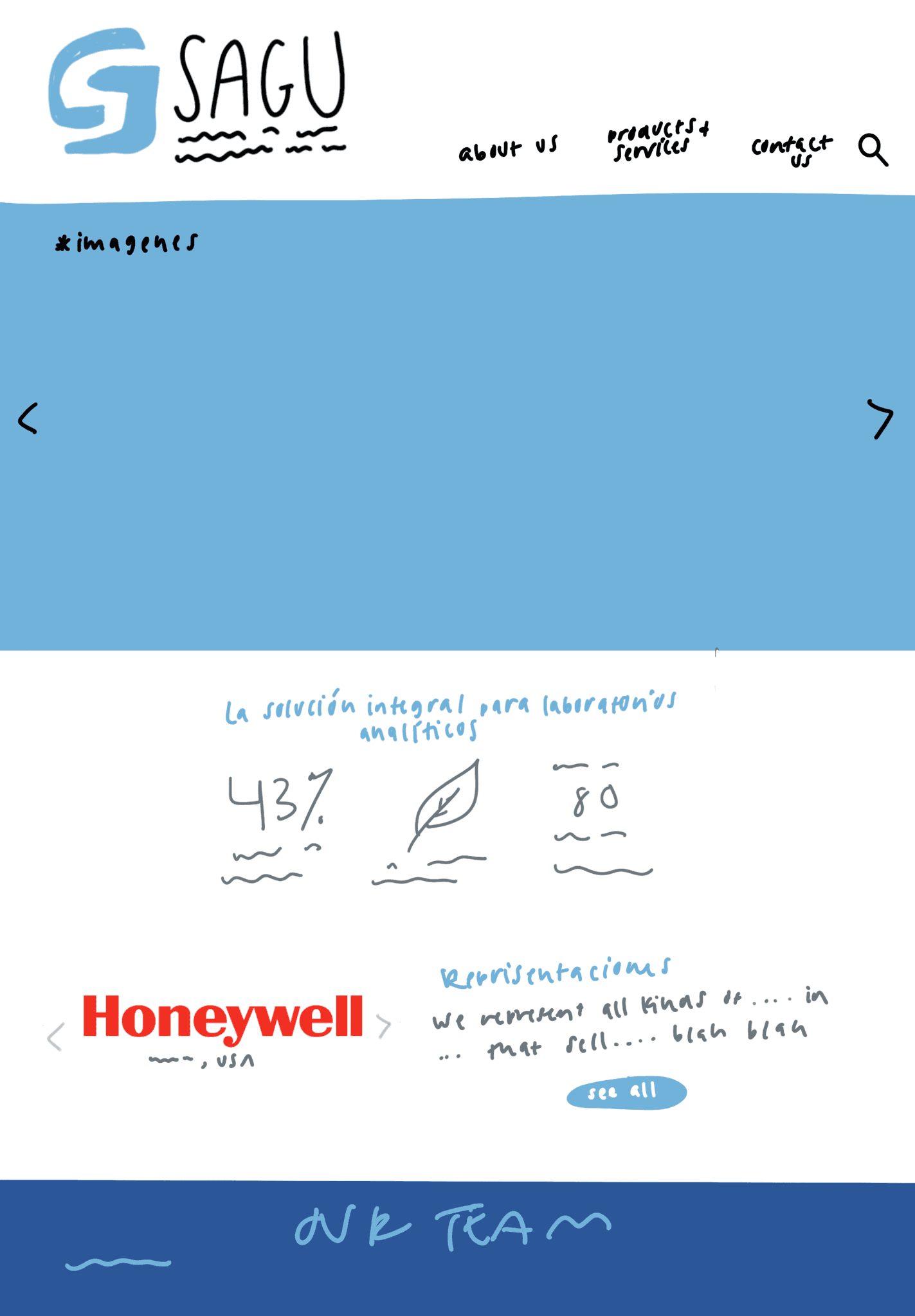 In the ideation phase, I explored various design concepts to enhance Sagu’s website. I began with sketches to lay out a more intuitive navigation structure, focusing on clarity and usability. Inspired by competitors like Honeywell, I created wireframes that emphasized visual hierarchy and simple navigation, allowing users to quickly access key sections such as Products, Our Team, and Contact Us.